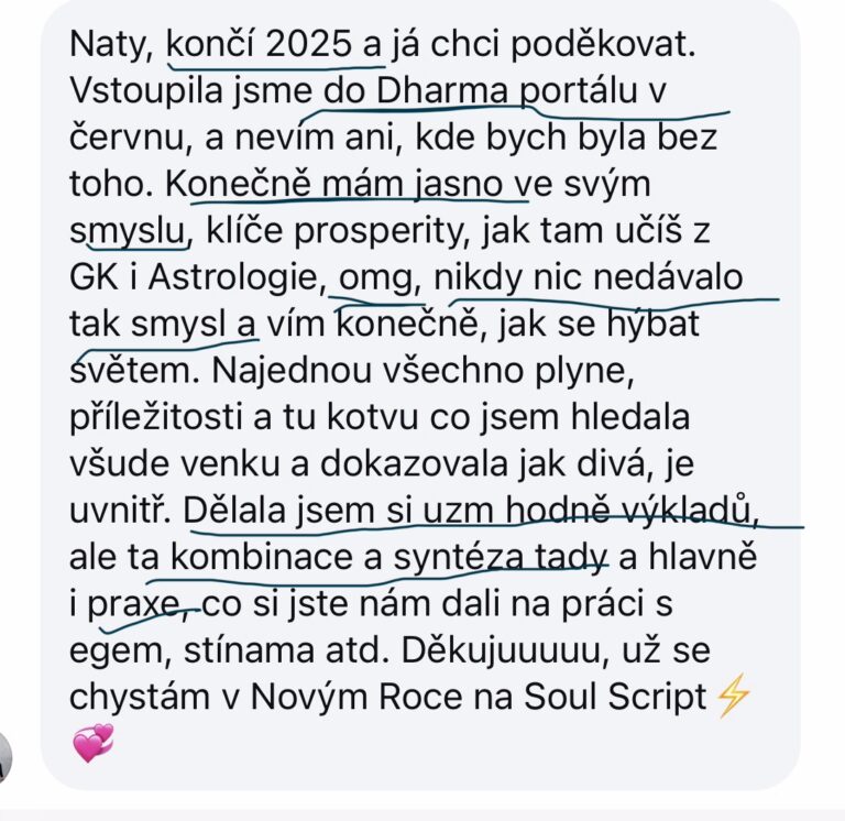 Jsi tu, abys aktivovala svoje poslání a vedla sebe a tvorbu podle svého SOULadu- DHARMY. Odpověď není venku, nikdy nebyla.