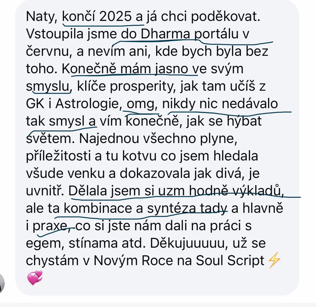 "Jsi ODPOVĚĎ na účel, co ti Bůh dal. Svět nepotřebuje kopii ani tvůj výkon. Potřebuje Tvůj SOULad. A soulad je tvoje Dharma."