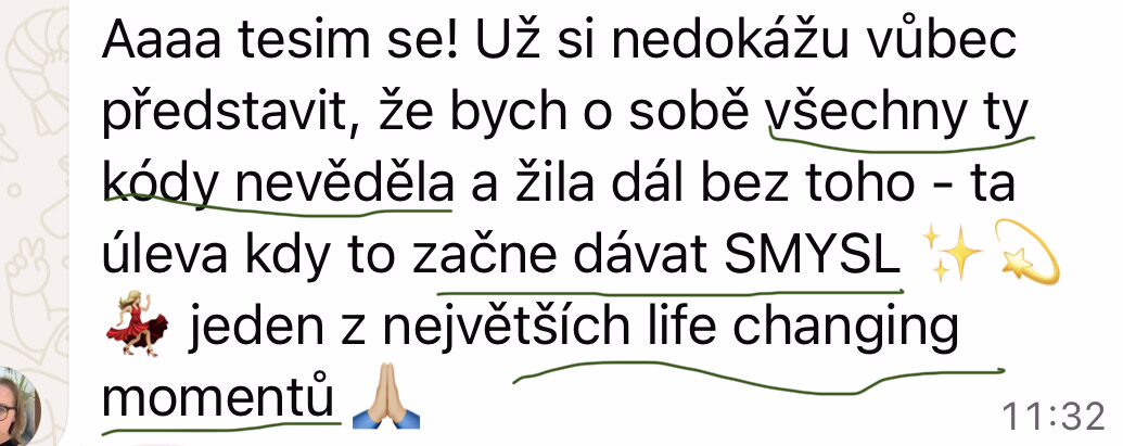 Chyběl mi prostor, který jde za hranice obecného výkladu. Ne víc informací - napojení na rytmus těla a přesný směr energie. Schopnost se v sobě vyznat a aplikovat to přesně- do těla, tvorby, žité frekvence...a povolala i svou soul ženu.